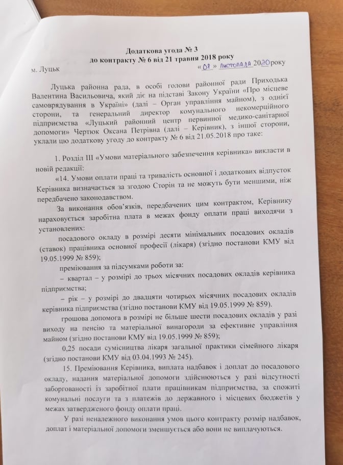 «Цікаві дані ми помітили і в додатку до контракту пані Оксани. Не буду багато коментувати. Просто залишу його фото. Можливо, когось наштовхне на думку, як от можна стимулювати роботу спеціалістів, преміювавши у розмірі 24 посадових окладів», – написала Ольга Максимяк.85 % коштів, які отримує Луцький РЦПМСД, витрачає на заробітні плати, 15 % – на розвиток.