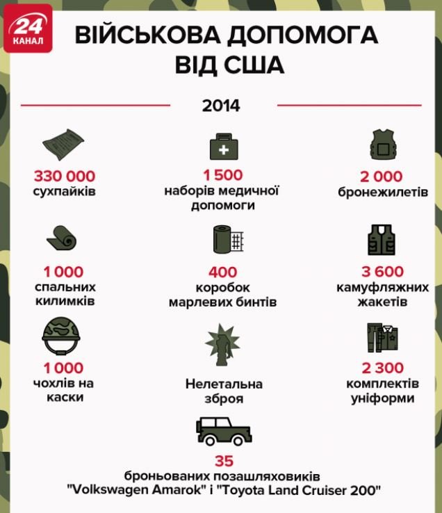 Після надання перших 330 тисяч сухпайків та екіпірування (бронежилети, набори медичної допомоги, каски тощо), тодішній президент Штатів Барак Обама заговорив і про намір надати українським Збройним силам військове обладнання на суму 5 мільйонів доларів. Тоді ЗМІ підрахували, що це – вартість 600 приладів нічного бачення і порівнювали цю суму з тією, яку РФ виділяла для бойовиків на Донбасі. За підрахунками, лише за перші два місяці Москва надала їм 250 мільйонів доларів.