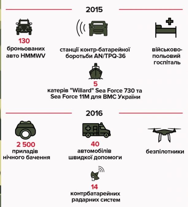 У 2016 році на оборону України Штати виділили 335 мільйонів доларів. На цю суму було закуплено 2500 приладів нічного бачення, 40 автомобілів швидкої допомоги та 14 контрбатарейних радарних систем (призначені для виявлення та відстеження пострілів артилерії та ракетних пусків, для забезпечення контрбатарейного вогню).