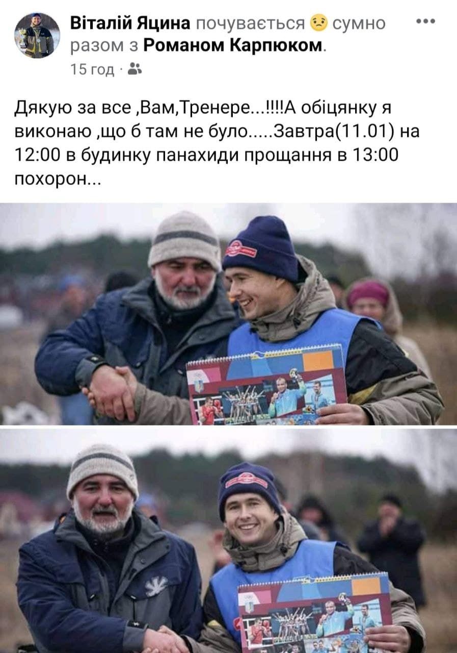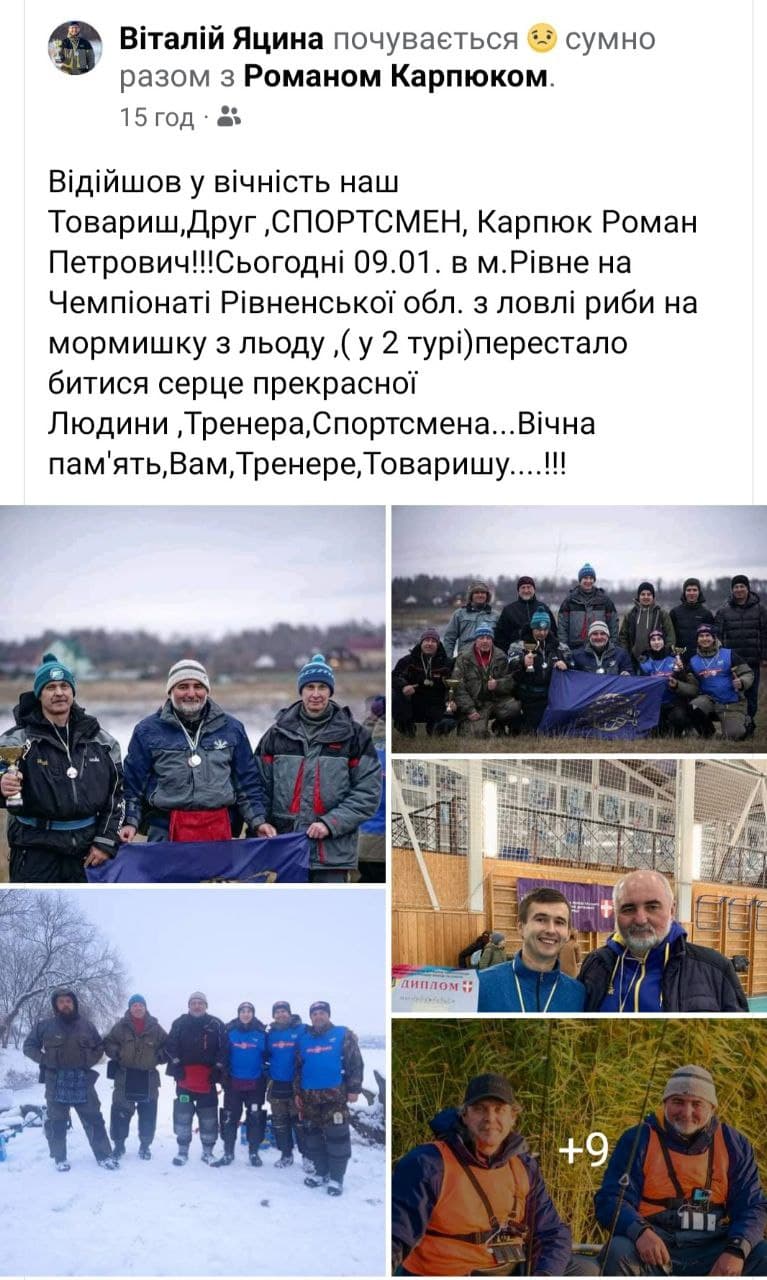 Ось що пишуть про спочилого у Федерації риболовного спорту Волинської області:Водночас один із членів Федерації риболовного спорту Волинської області Віталій Яцина обіцяє тренеру та другу виконати відому тільки їм обіцянку, «щоб там не було»: