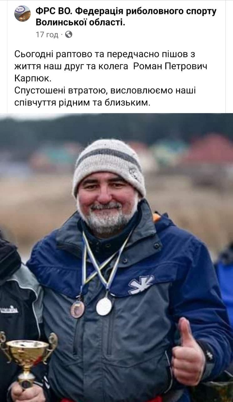Серце цього непересічного чоловіка перестало битися у святковий день, 9 січня, на 57 році життя. Роман Карпюк помер просто під час спортивних змагань із зимової риболовлі на Рівненщині. Його раптовий відхід у вічність неабияк сколихнув громаду.