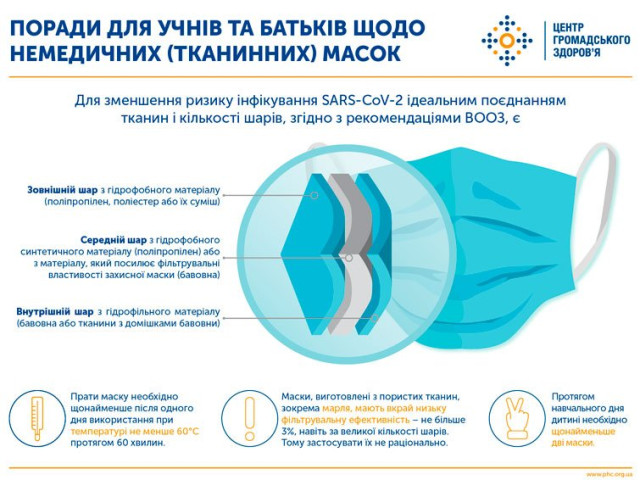 Проте у Центрі громадського здоров'я попереджають, що дитині протягом навчального дня необхідно щонайменше дві маски для зміни в разі забруднення.