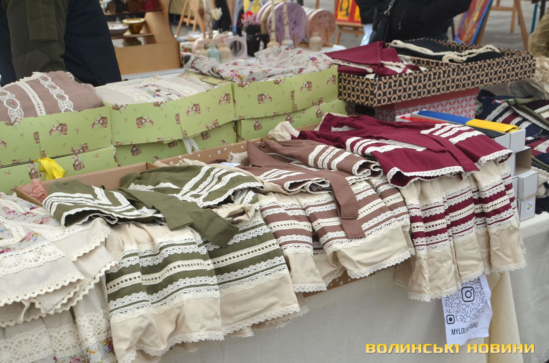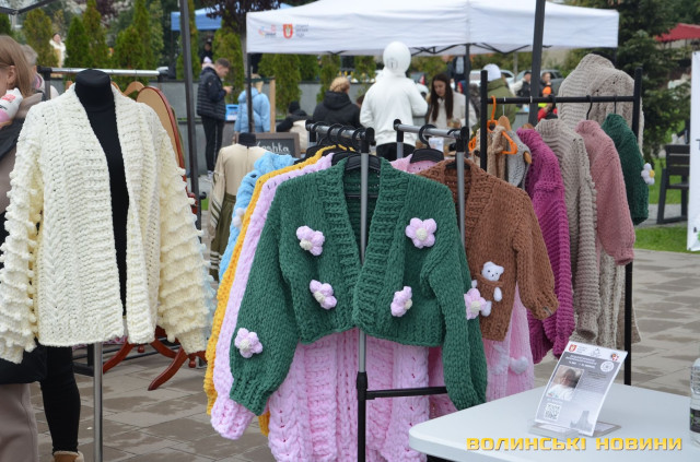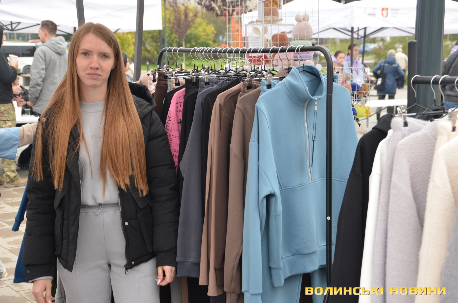 «В’язання – це моє заняття для душі. Розпочала ще п’ять років тому із косинок і капелюхів, далі були пледи й дитячі іграшки. Дуже люблю свою роботу, усе в’яжу із любов’ю. Навіть якщо десь не вийде, то кілька разів перев’яжу, аби зробити як слід. Про ярмарок у Луцьку випадково дізналася в інтернеті й вирішила приїхати. Подобається це місто», – зауважила Неля Фінчук.У Тетяни Чабан із Львівщини у війську теж двоє дітей – син і донька. Вона – ще одна дебютантка ветеранського ярмарку. Привезла на продаж ароматичні свічки.«Я в захваті від події, бо це нові враження, нові знайомства й допомога військовим. П’ять років тому почала вивчати ефірні олійки. Із часом вирішила поєднати із воском, що чудово передає запахи. Кашпо для свічок заливаю сама. Кожна свічка – особлива й неповторна», – розповіла жінка.З-поміж постійних учасників – дружина полеглого воїна Юрія Оверчук. У пам’ять про чоловіка в 2023-му вона заснувала бренд одягу «MOver». Перша літера від імені Матвій, а Овер – його псевдо.
