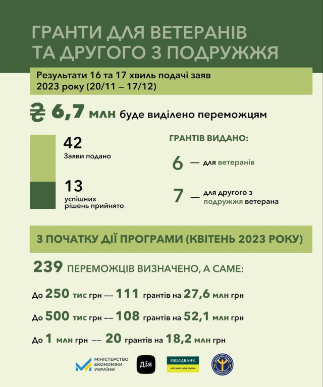 «239 ветеранів та членів їхніх родин визнані переможцями ветеранського компоненту програми «Власна справа». Загалом вони отримають гранти на старт або розширення свого бізнесу на майже 100 млн грн. 80% переможців вже отримали кошти на свої рахунки та можуть інвестувати їх у започаткування або масштабування своєї справи«,- зазначила Бережна.З її слів, грантоотримувачі також створять близько пів тисячі нових робочих місць, на які можуть взяти, зокрема, й своїх побратимів і таким чином допомогти їм швидше адаптуватись до цивільного життя.