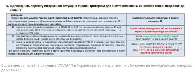 Зазначається, що кількість нових випадків коронавірусу на 100 тис. населення протягом останніх 14 днів має дорівнювати або бути нижче за середній показник у країнах ЄС (станом на 30 червня – 16 випадків на 100 тис.). Тоді як в Україні вона перевищує цей показник в шість разів.