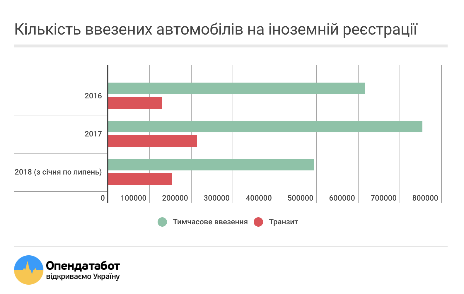 За перші шість місяців 2018 року (станом на 18 липня) обсяги транзиту авто з іноземною реєстрацією перевищили показники всього 2016 року і становили 152,4 тис. штук.При цьому 57,9 тис. "транзитних" автомобілів перебувають в країні з порушеннями терміну.