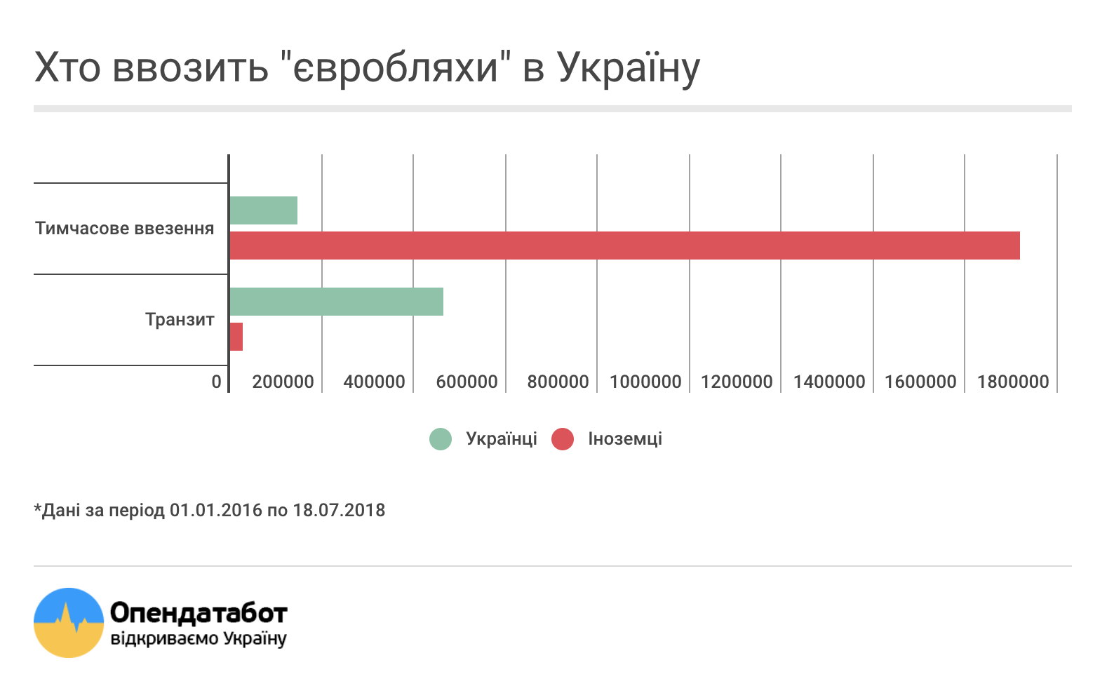 Якщо ж говорити про авто, які були ввезені в режимі тимчасового ввезення, то в 2016 році в Україну було ввезено 616 тисяч "блях". В 2017 році обсяги ввезення авто, які мали право перебувати в Україні, значно зросли і становили 753,3 тис. штук. У січні-липні 2018 року в Україну всього потрапило 493,3 тисяч "євроблях".