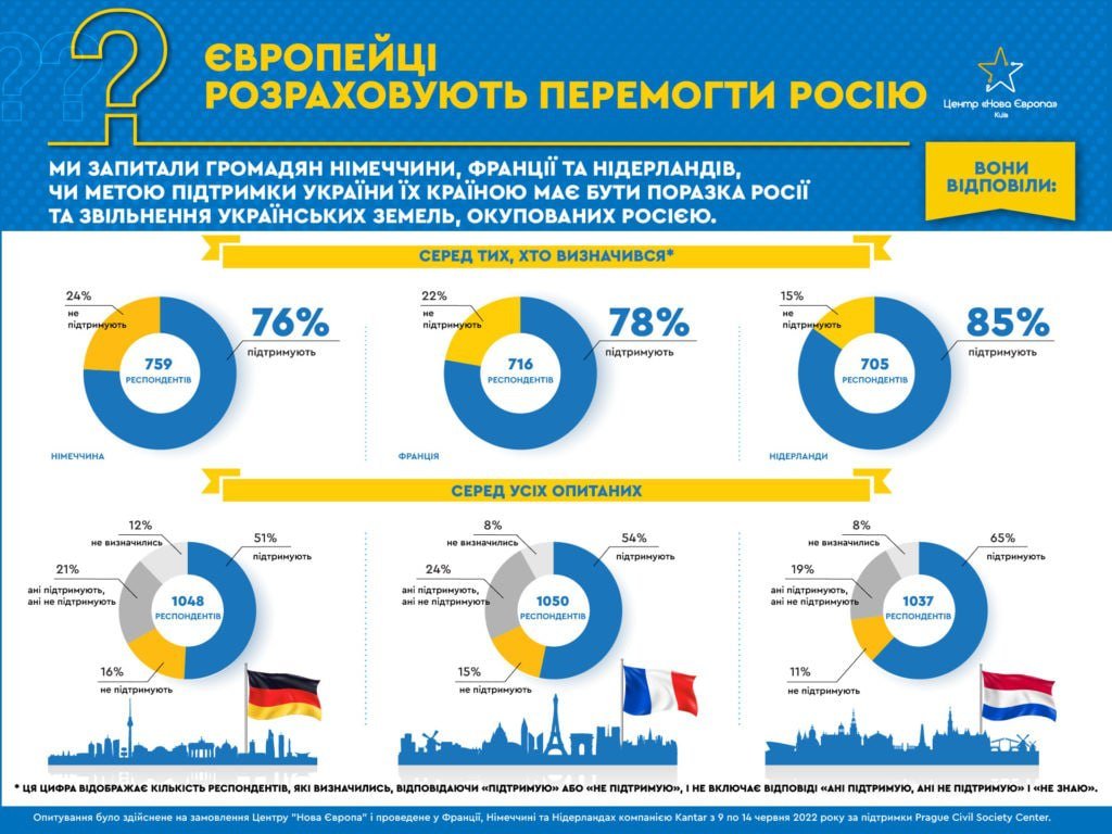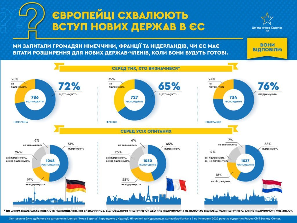З-поміж тих, хто визначився зі своєю позицією, надання Україні кандидатства підтримують 68% німців, 65% французів і 65% нідерландців, натомість 32% жителів Німеччини і по 35% – Франції та Нідерландів виступають проти.