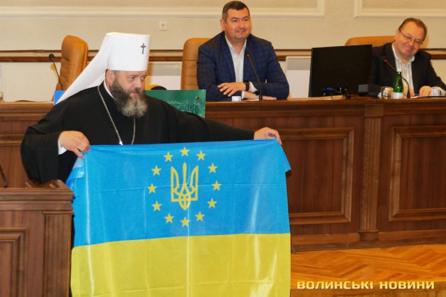 Врешті депутати майже одноголосно підтримали проєкт рішення й надали слово владиці Михаїлу. Той прийшов до облради з подарунками: «оновленими» картою світу та прапором України.
