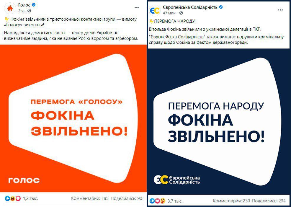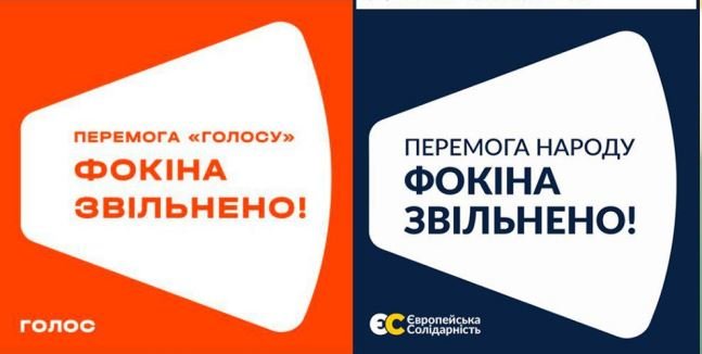 Проте через годину у соцмережі на сторінці «Європейської солідарності» з'явилася схожа картинка. Але замість «перемога Голосу» написано «перемога народу». Цим у партії буцімто хотіли присоромити зарозумілих «голосят» і показати, щоб знали, як «перемогу» собі приписувати. При цьому встигли пропіаритись і самі, вимагаючи нібито порушити кримінальну справу щодо Фокіна за фактом державної зради.Як повідомлялося, сьогодні Президент України Володимир Зеленський підписав указ, яким вивів Вітольда Фокіна зі складу делегації України на переговорах у Мінську.