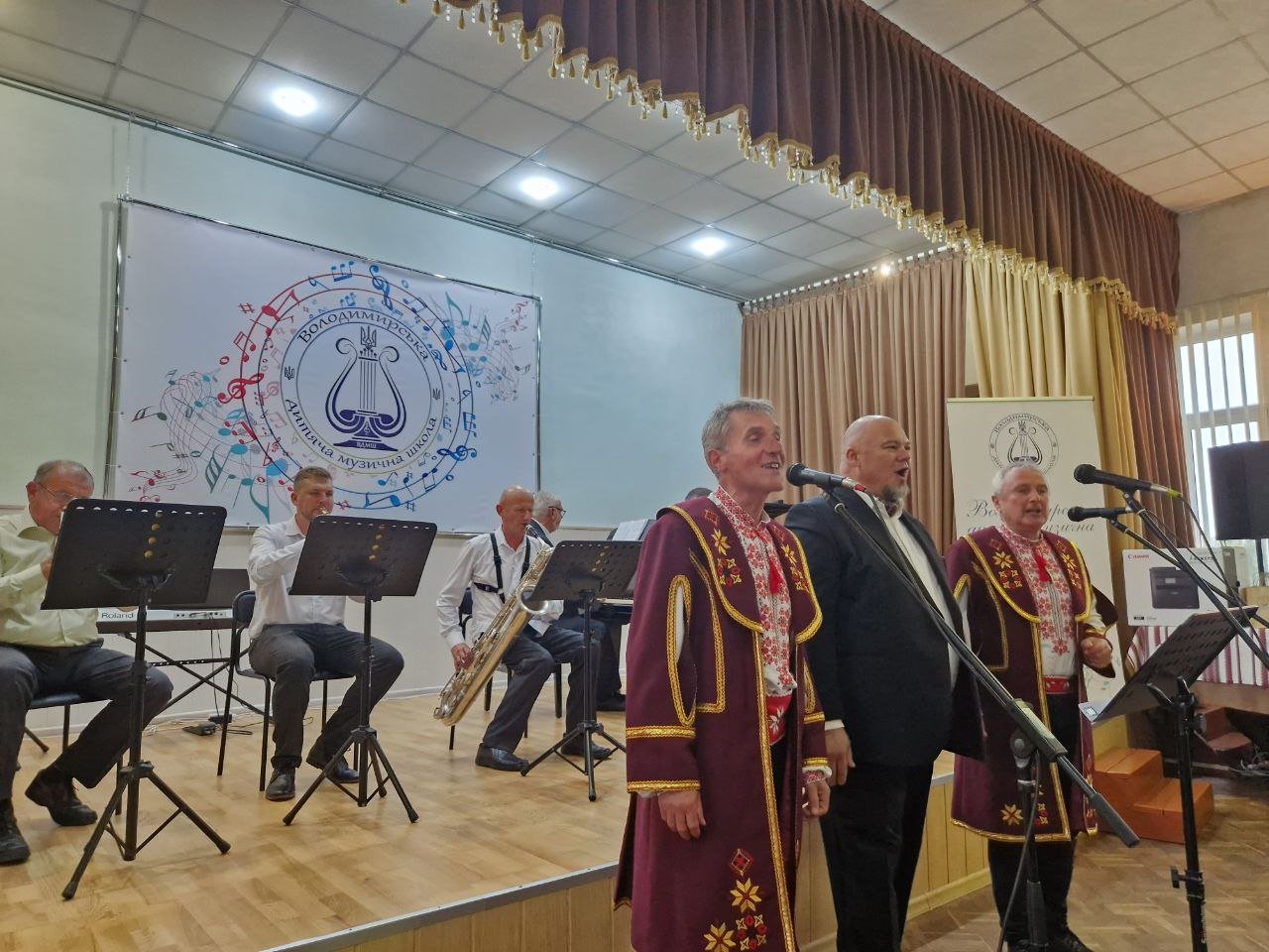 Своїм талановитим виконанням різноманітних музичних номерів святкову атмосферу цього дня створювали і теперішні учні школи та їхні викладачі. Разом з колегами-музикантами співав і директор Роман Віслобоков.