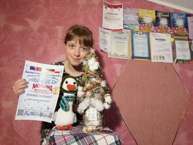 Друга перемога Дарини – це диплом І ступеня V міжнародного багатожанрового дитячого онлайн-фестивалю «Моя зимова казка», який відбувся 30 грудня в Краматорську. Дівчинка отримала переконливу перемогу в номінації «Декоративно-ужиткове мистецтво», 7 віковій категорії.Керівниця гуртка Жанна Лінник тепло відгукнулася про обдаровану вихованку, відзначила її працьовитість і вмотивованість: «З Даринкою ми займаємось дистанційно. 1-2 рази на місяць вона приходить для уточнення деталей і корекції. Вона навчається в 11 класі і не може відвідувати заняття систематично. Отож, і конкурсні роботи готує майже самостійно».