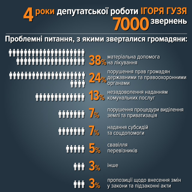 Аналіз роботи зі зверненнями з громадянами свідчить про те, що 38% звернень – це прохання людей про допомогу на лікування.