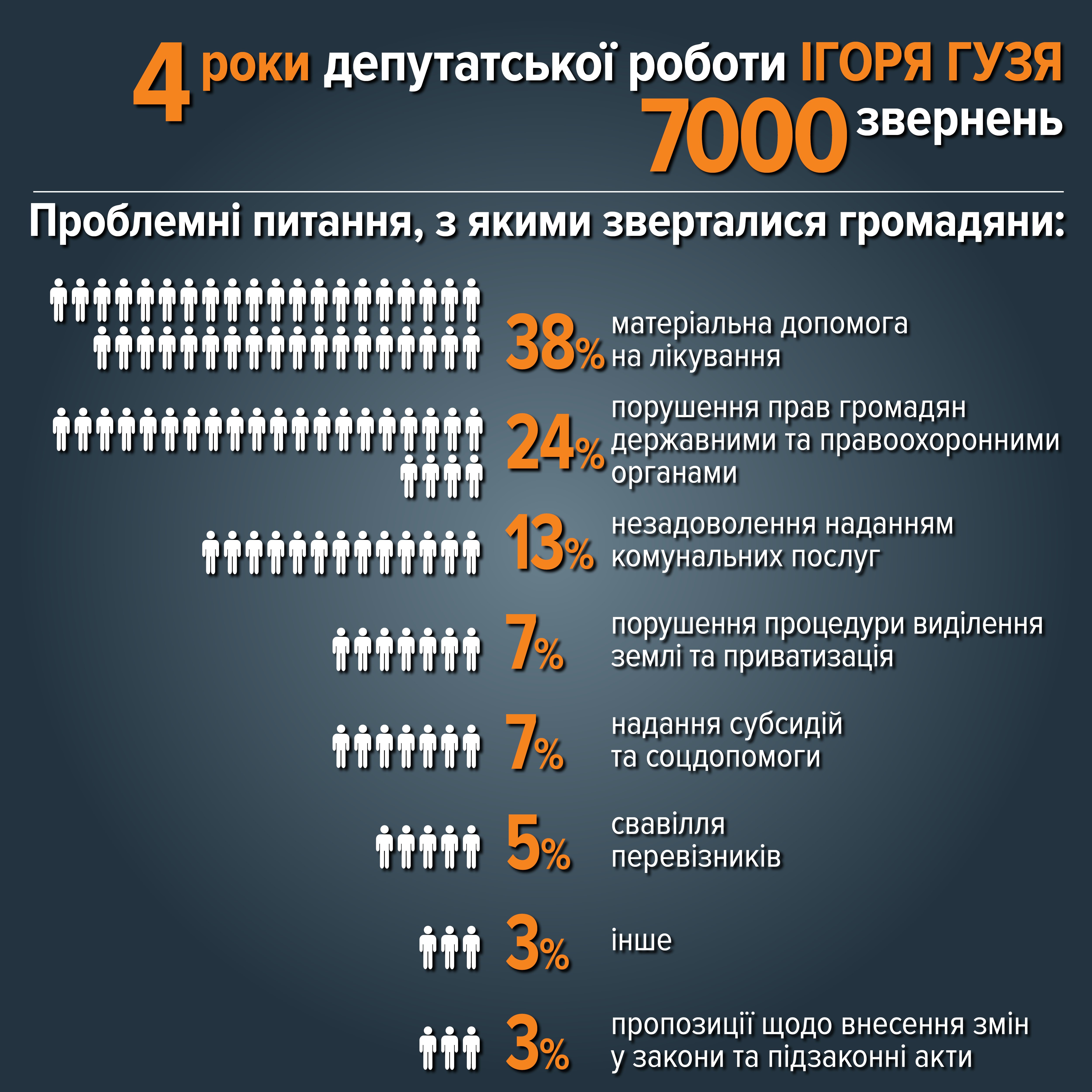 За 4 роки роботи до депутата Верховної Ради Ігоря Гузя звернулося понад 7 тисяч волинян. Про це народний депутат він під час прямого ефіру в соціальній мережі Фейсбук.
