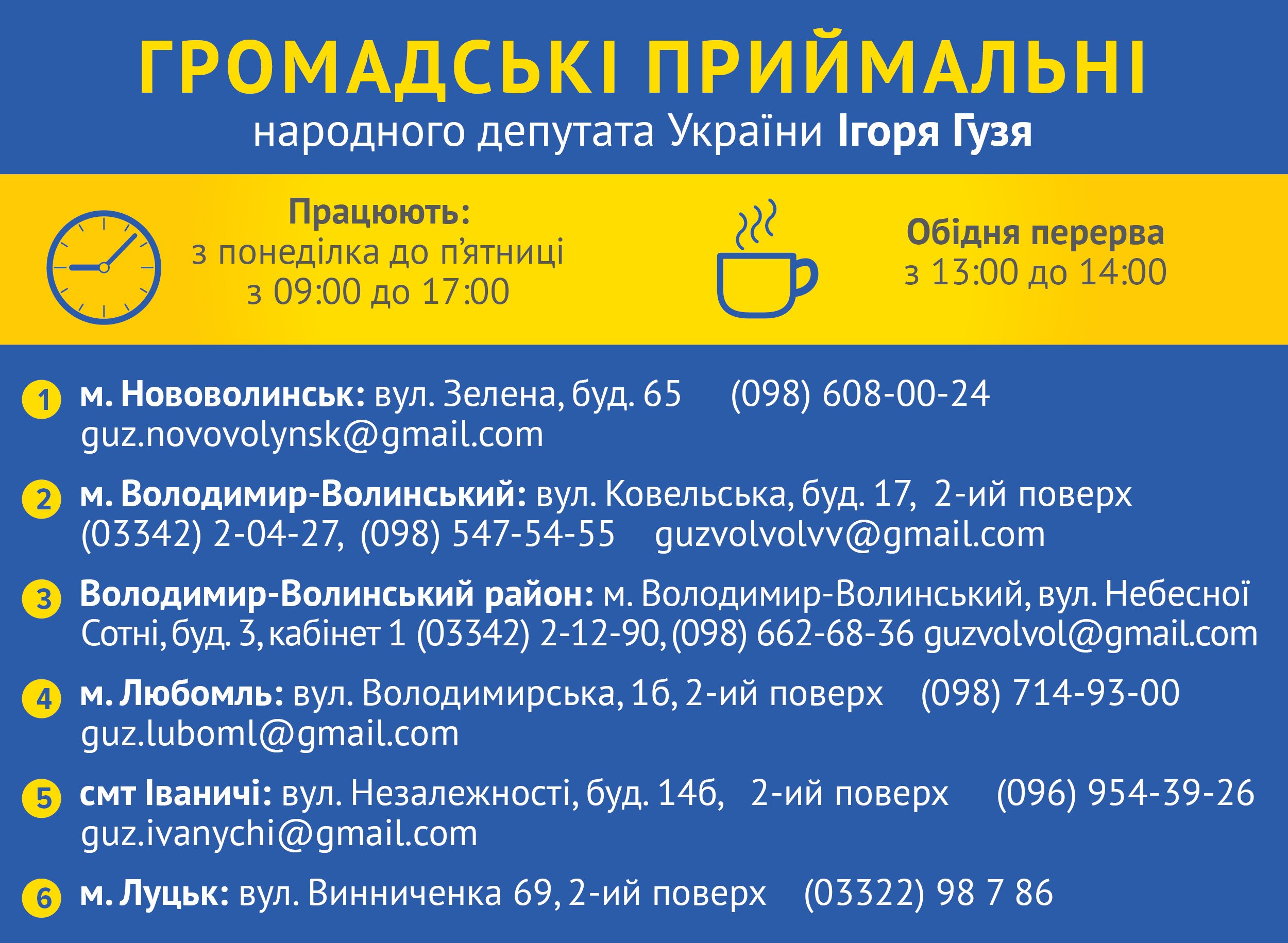 Громадські приймальні парламентаря працюють у містах Нововолинськ, Володимир-Волинський, Любомль та Луцьк, а також – у селищі Іваничі.