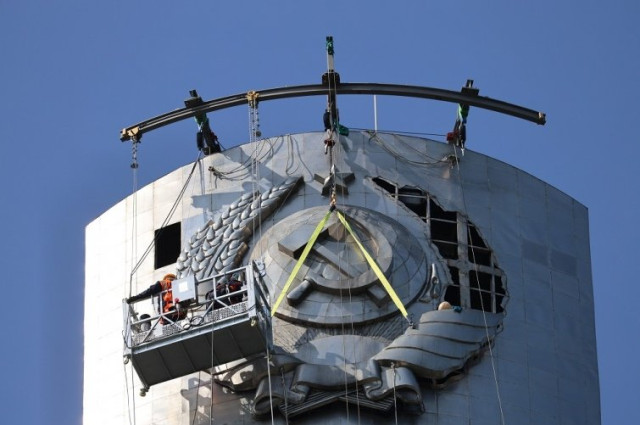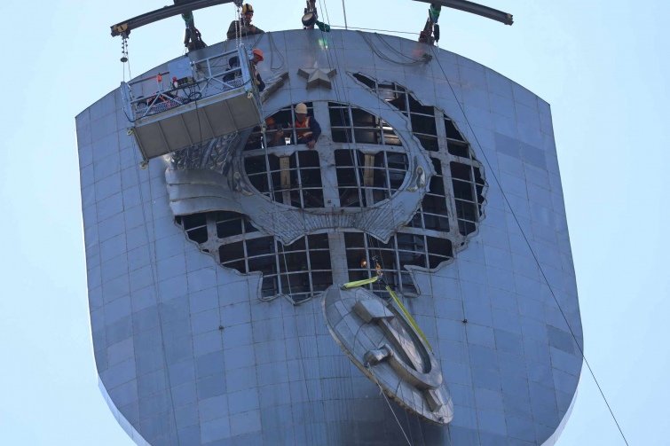 За демонтажем сьогодні спостерігав в.о. міністра культури та інформаційної політики Ростислав Карандєєв. Він зазначив, що наразі на наших очах відбуваються історичні події, бо з кожним новим знятим елементом герба країна позбавляєтьося залишків радянського минулого.