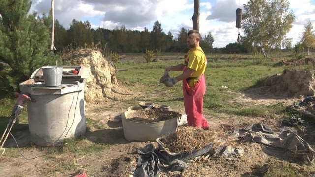 Щодо технології, говорить Олександр Гуч, то спершу вимішується глина з піском. Після того, як ця суміш стає однорідною, додається дрібна солома. Отриману масу вимащує на стіни хати. У роботі використовує рукавиці, щоб берегти шкіру, від холоду зокрема.