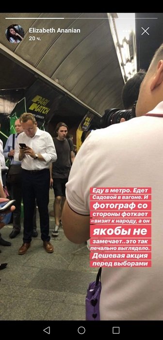 «Їду в метро. Їде Садовий у вагоні. І фотограф з боку фоткає «візит до народу», а він нібито не помічає. Це так сумно виглядало. Дешева акція перед виборами», – повідомляє користувач Elizabeth Ananian в своїй історії на Facebbook.