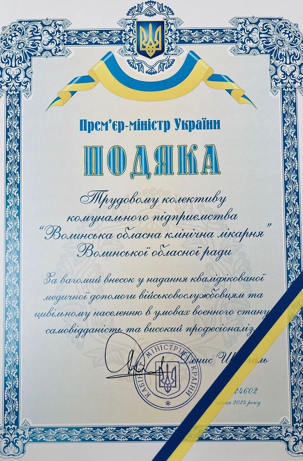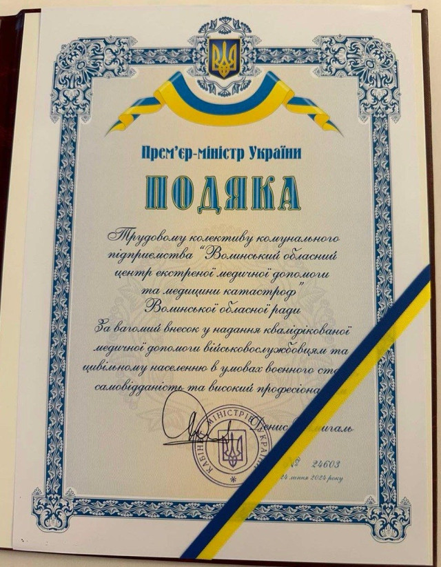 З нагоди професійного свята колективи волинської екстренки та обласної лікарні отримали подяки від прем’єр-міністра