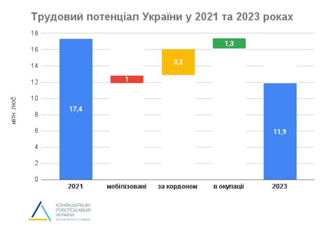 З початком війни 1 млн громадян було мобілізовано на захист України. Станом на початок 2023 року за межами країни перебували 4,6 млн українців, з яких 3,2 млн – жінки працездатного віку. На тимчасово окупованих з початку 2022 року територіях жили 3 млн осіб, з них орієнтовно 1,3 млн працездатного віку.«Тобто з початку повномасштабного вторгнення Україна втратила доступ до 5,5 млн людей працездатного віку. Це трохи більше 30% всієї робочої сили», – йдеться в повідомленні.