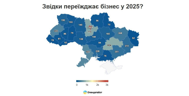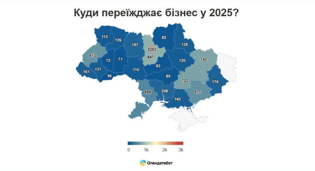 Водночас Київ залишається і головним пунктом призначення, куди переїжджає бізнес – 2 252 компанії обрали його новим місцем роботи. Наслідують Київщина (847), Харківщина (742), Дніпропетровщина (722) та Львівщина (613).