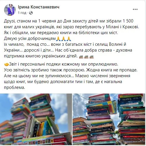 «З метою підтримки маленьких українців за кордоном 12 травня розпочали збір книг для дітей та юнацтва. Книги збирали адресно для BibliotecaUcrainaPiù в Мілані та FundacjaZustricz у Кракові. Вони різні за жанрами: від дитячих казок до літератури для підлітків, книги-розвивайки, віршики, загадки, розмальовки, дитяча періодика. Більш ніж за два тижні вдалося зібрати 1500 книг. Пропозиції про долучення до нашої акції і далі надходять. Тому будемо розширювати горизонти. Аби українське слово і українська книжка були в кожному куточку світу», – наголошує Ірина Мирославівна.Діти, які передавали книги, також писали листи одноліткам, докладали малюнки. Народна депутатка подякувала усім, хто долучився до акції.