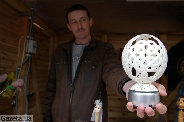 Микола Сірик півтора роки стиворює вироби мистецтва зі страусиних яєць. Показує світильник з одного.