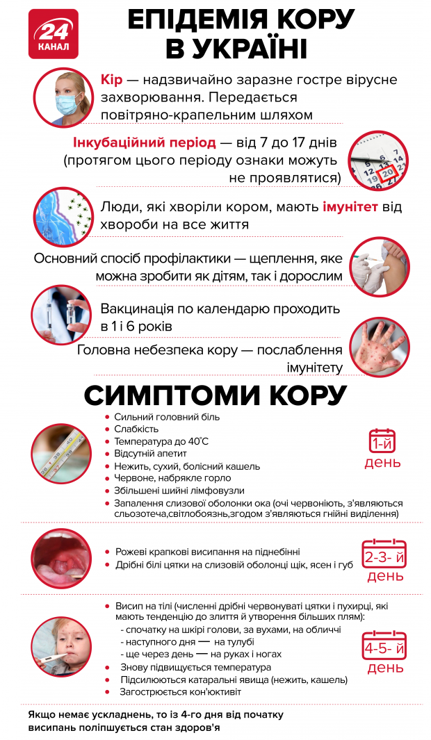 Загалом із 6 грудня 2018 року до 3 жовтня захворіли 58051 людини – 27 494 дорослих і 30558 дітей, від ускладнень кору померли 20 людей, пише канал 24.