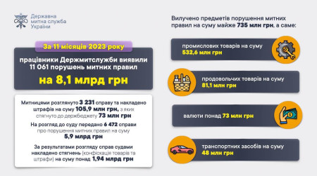 Протягом січня-листопада 2023 року митниці Державної митної служби України виявили 11061 порушення митних правил на суму 8,1 млрд грн.
