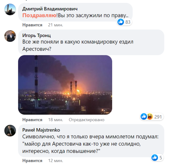«Це за чергову Чорнобаївку?», «Все ж таки зрозуміли, в яке відрядження їздив Арестович?», «Я гадав, що вже давно генерал», «Вітаю! Ви це заслужили по праву», – написали під фото.