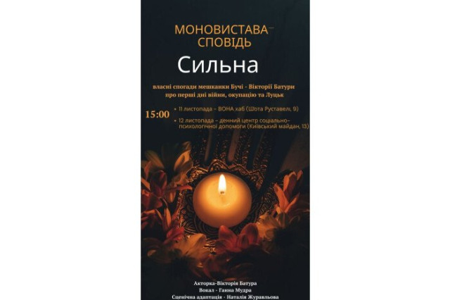 Особлива подія на відкритті: моновистава-сповідь «СИЛЬНА» заснована на спогадах Вікторії Батури – мешканки Бучі. Це живе відображення перших днів війни, де кожне слово – це сповідь, кожен рядок – біль і незламність.Читати ще: «Герої наших вулиць»: у центрі Луцька відкрили банерну виставку