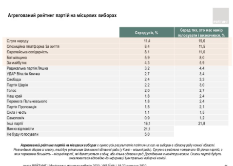 Сумарний рейтинг інших партій (переважно місцевих), які беруть участь у місцевих виборах та були включені у список для дослідження, – 22,2%.Про свою участь у місцевих виборах заявили 58% опитаних. 21% вагаються (50/50), ще 8% – можливо візьмуть участь, 13% – малоймовірно. У разі загострення ситуації з коронавірусом готовність взяти участь у виборах підтвердили 46%, 23% вагаються (50/50), 9% – можливо прийдуть на дільниці, 21% – малоймовірно. За останній тиждень тенденції стосовно декларованої явки практично не змінилися.