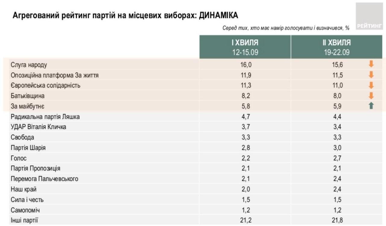 Умовний 5%-й бар’єр на місцевих виборах долають п’ять партій, майже кожна з яких за останній тиждень покращила свій результат. Натомість єдиною партією, яка нарощує, а не втрачає рейтинг, є «ЗА Майбутнє».
