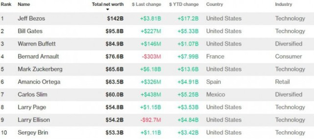 Найбагатшою людиною залишається голова Amazon та Blue Origin Джефф Безос - його статки перевищують 140 мільярдів доларів.