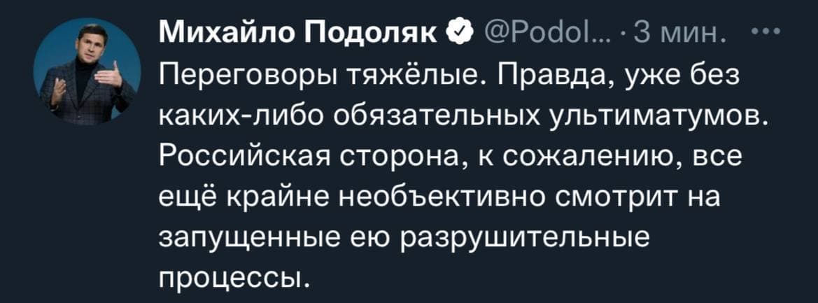 «Сторони визначили низку пріоритетних тем, щодо яких намітилися певні рішення. Щоб ці рішення отримали якісь можливості імплементації в логістичні рішення, сторони їдуть для консультацій до своїх столиць. Сторони обговорили можливість проведення найближчим часом другого раунду переговорів, на яких ці теми матимуть конкретну практику розвитку», — заявив Подоляк.