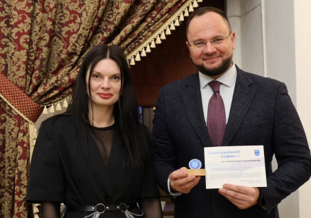Під час церемонії вручення дипломів та нагрудних знаків Почесним амбасадорам та амбасадоркам міста директорка БО «БФ «Ангар. Україна» Ольга Валянік вручила Луцькому міському голові Ігорю Поліщуку відзнаку благодійного фонду – бофон.