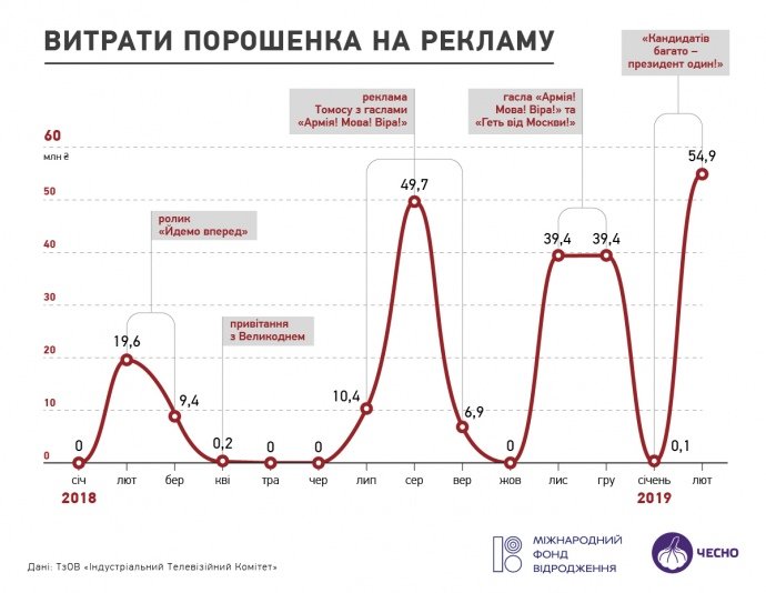 Крім того, приблизно 230 мільйонів Порошенко витратив на телерекламу 2018-го та протягом перших двох місяців 2019 року, що у 2,5 рази більше, ніж коштувала вся кампанія Порошенка 2014 року.