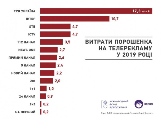 Відповідно до розцінок телеканалів, за перший квартал 2018-го на рекламу в Порошенка мали б витратити щонайменше 29 мільйонів гривень.«Найбільше в Порошенка заплатили ТРК «Україна» Ріната Ахметова. Там за секунду реклами у прайм-таймі в будні правлять до 5 658 гривень. Тобто ролик тривалістю 30 секунд коштує майже 170 тисяч, а хвилинний – до 400 тисяч з урахуванням податків», – повідомляють у ЧЕСНО.