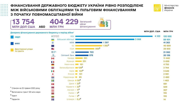 Джерелами фінансування державного бюджету від початку повномасштабної війни РФ проти України передусім є військові облігації та міжнародна допомога – усього за понад два місяці надійшло 13,8 млрд доларів, або 404,2 млрд грн.