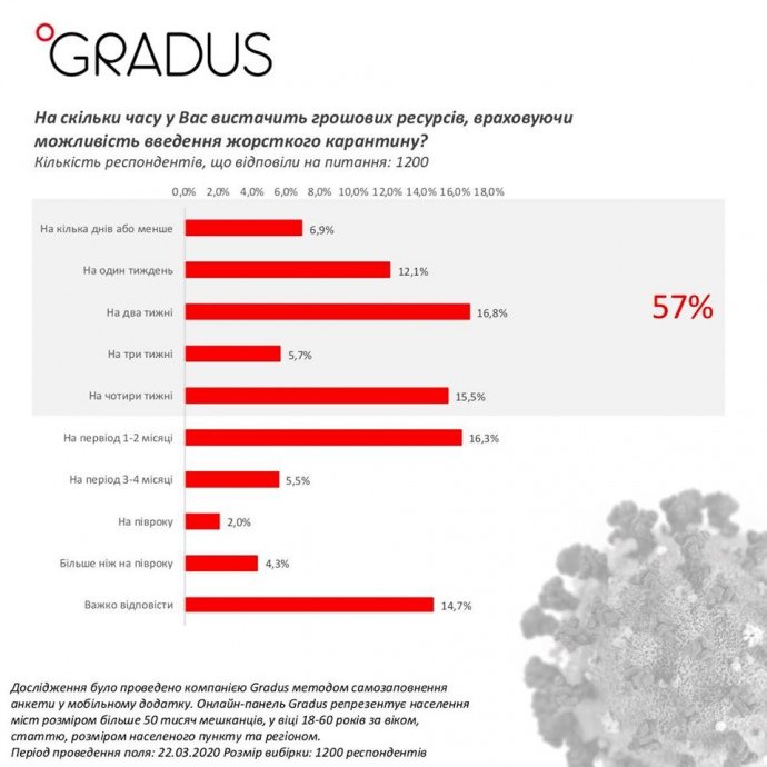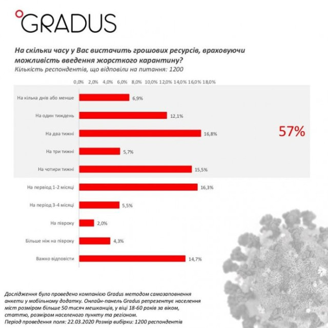 В цілому 57% відповіли, що гроші закінчаться менш ніж через місяць.