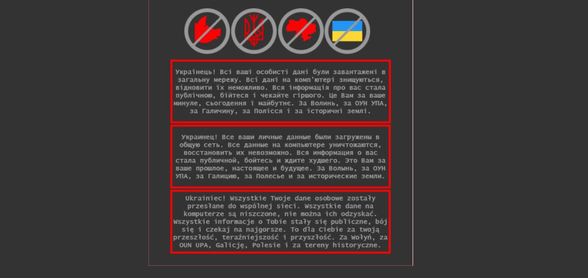 «Українець! Усі ваші особисті дані були завантажені в загальну мережу. Всі дані на комп’ютері знищуються, відновити їх неможливо. Вся інформація про вас стала публічною, бійтеся і чекайте гіршого. Це вам за ваше минуле, сьогодення та майбутнє. За Волинь, за ОУН УПА, за Галичину, за Полісся та за історичні землі».