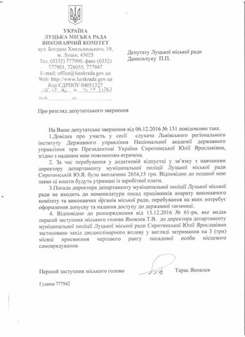 Про це йдеться у відповіді Першого заступника міського голови Тараса Яковлева на депутатське звернення голови фракції «Народного контролю» Павла Данильчука, повідомляє Народний контроль Волинь.