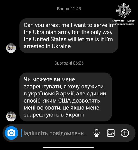 Американець звернувся до волинських патрульних із проханням заарештувати його, аби він міг служити в українській армії.