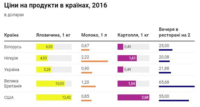 Ми взяли до уваги ціни на яловичину, молоко, картоплю та вартість вечері на двох у ресторані (3 страви). Цікаво, що хоч у Нігерії й набагато нижчі зарплати, ціни на картоплю та молоко відчутно вищі за українські. Продукти в Україні хоч і не найдешевші, але їх скоріш можна визначити як дешеві, аніж дорогі.Купівельна спроможність українців
