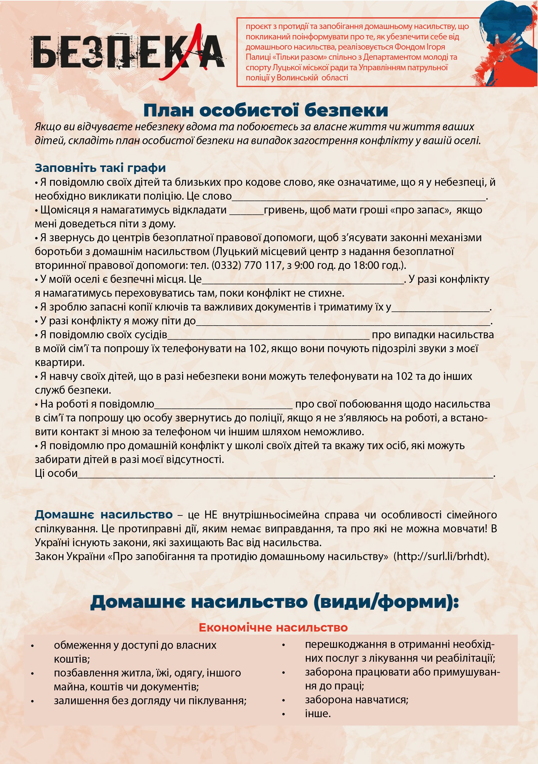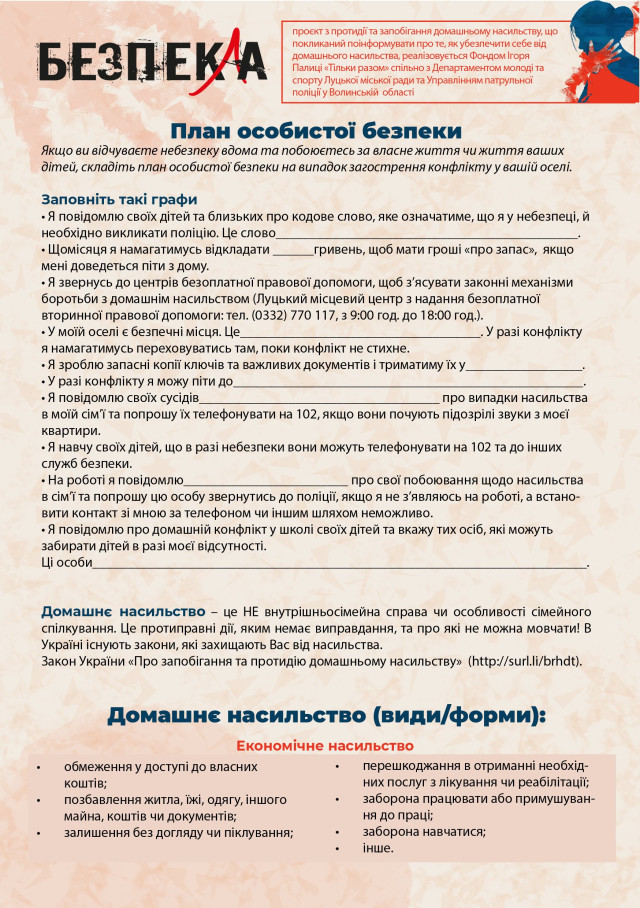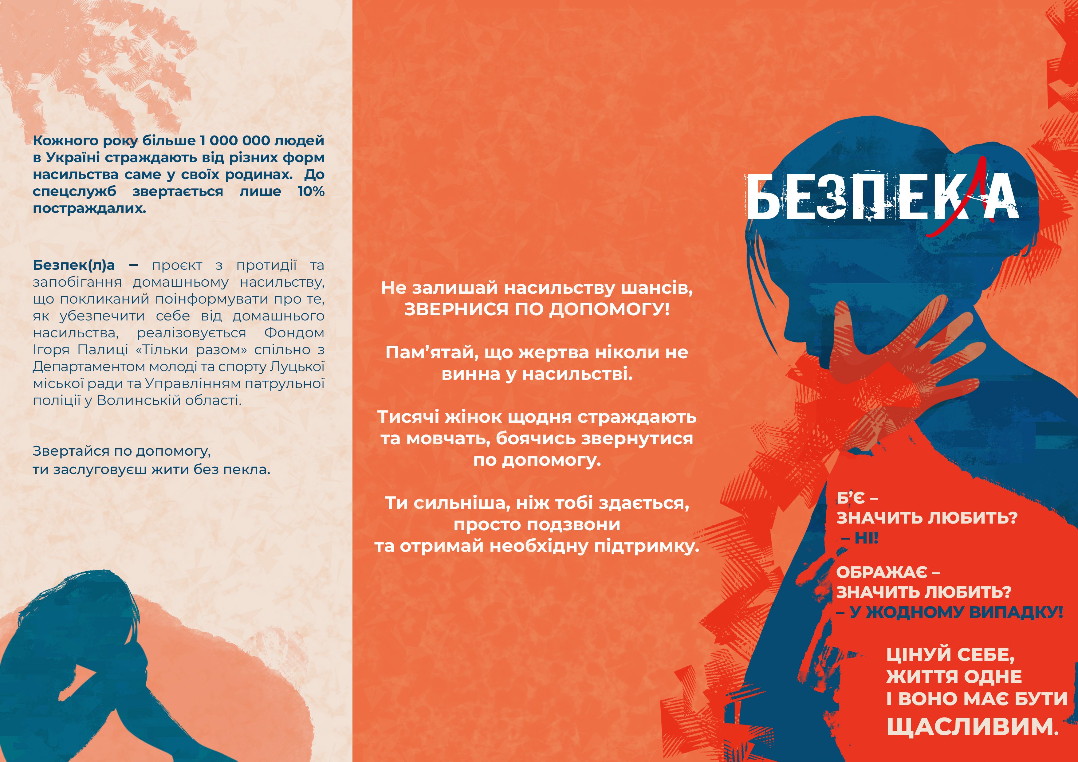 Соціальний проєкт «Безпек(л)а», що його організували Фонд Ігоря Палиці «Тільки разом», департамент молоді та спорту Луцької міської ради й патрульна поліція Волинської області, має на меті протидію та запобігання домашньому насильству й покликаний проінформувати про те, як убезпечити себе від домашнього насильства.