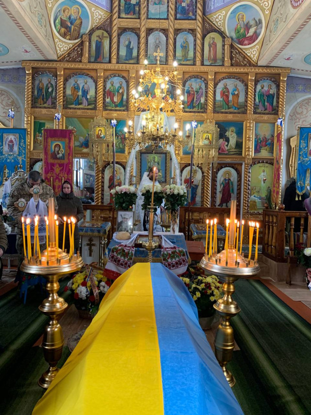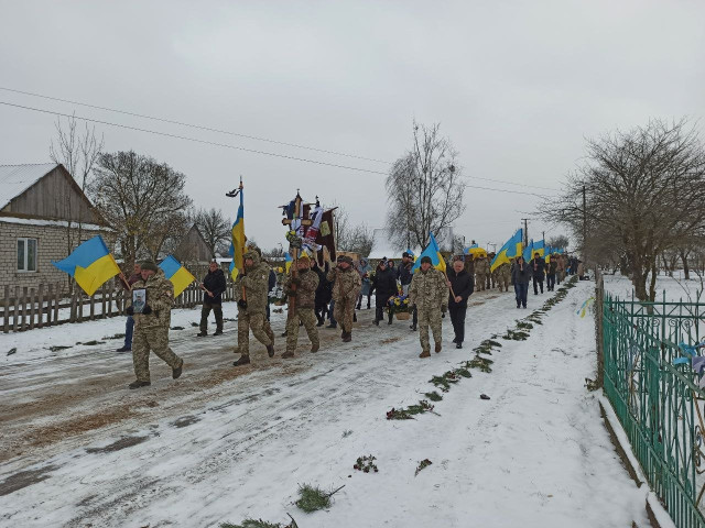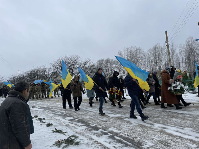 Попрощатися з полеглим Героєм прийшло усе село. Люди проводжали його навколішки, несли прапори та квіти.