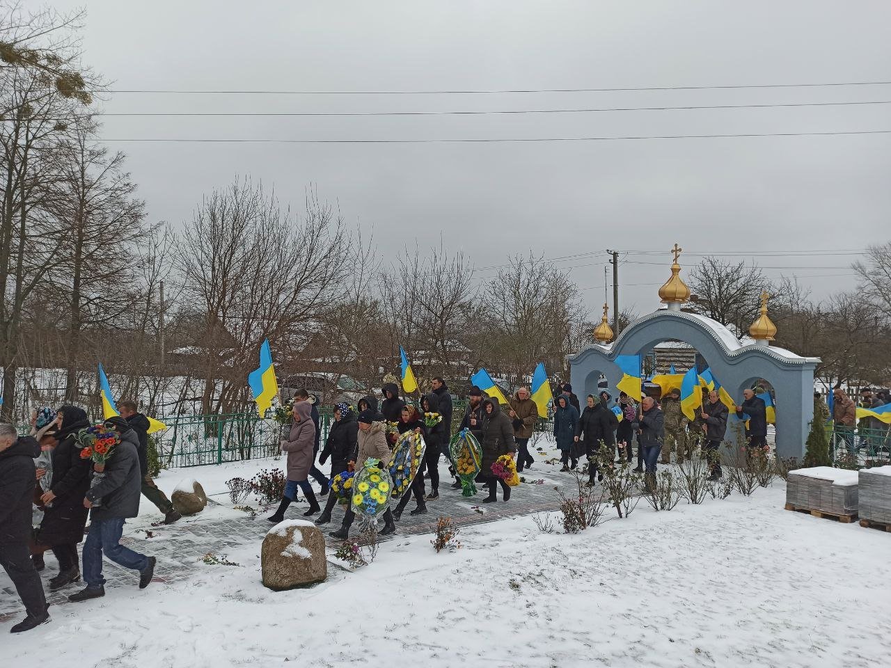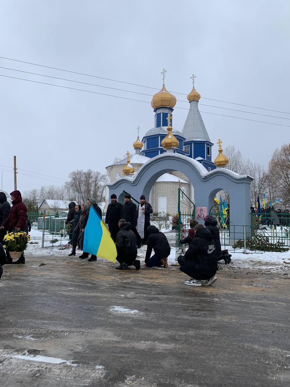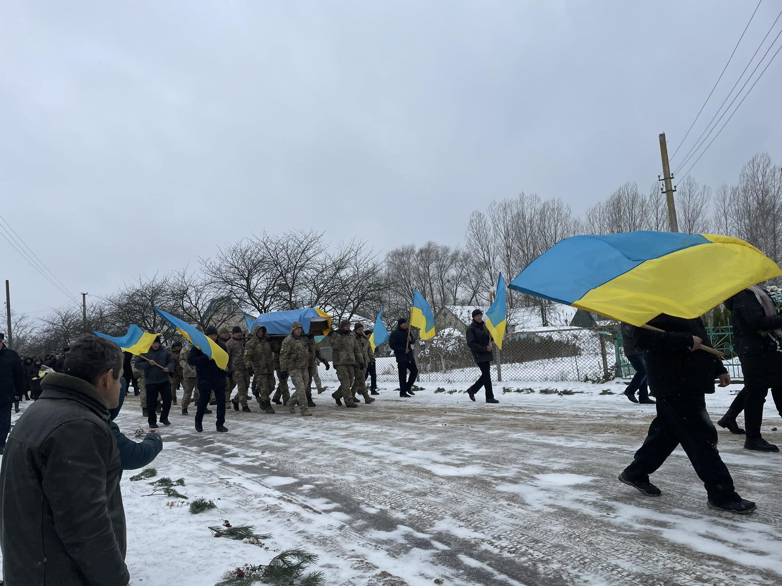 Попрощатися з полеглим Героєм прийшло усе село. Люди проводжали його навколішки, несли прапори та квіти.