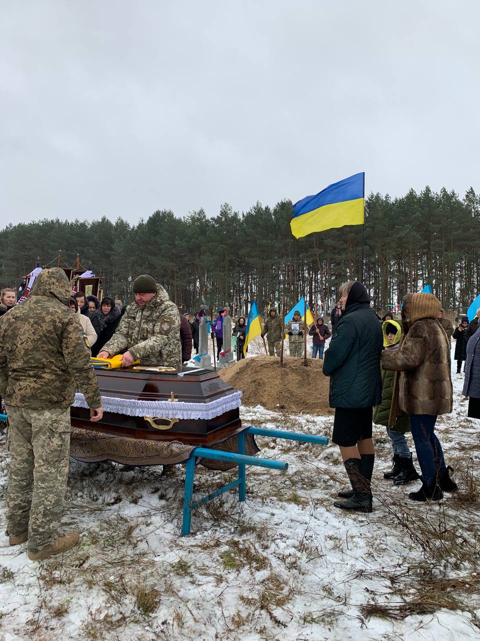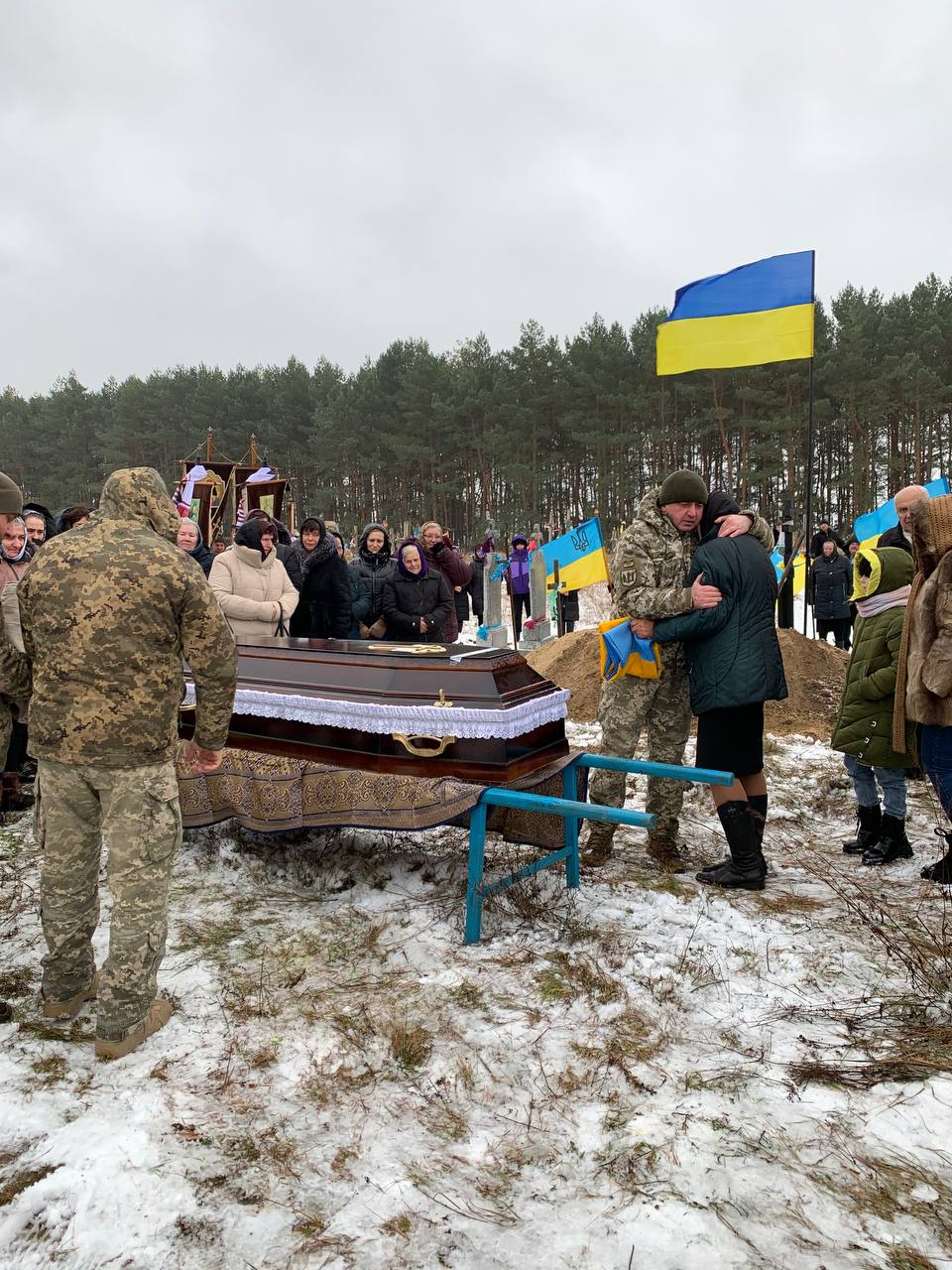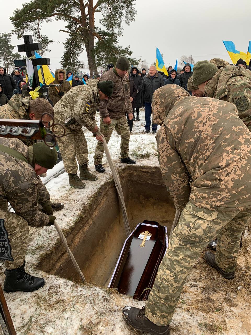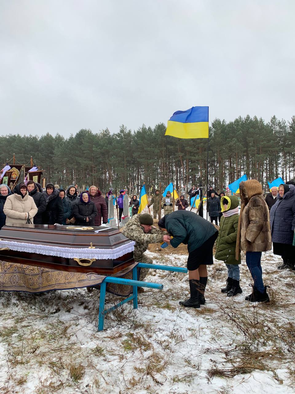 Попрощатися з полеглим Героєм прийшло усе село. Люди проводжали його навколішки, несли прапори та квіти.