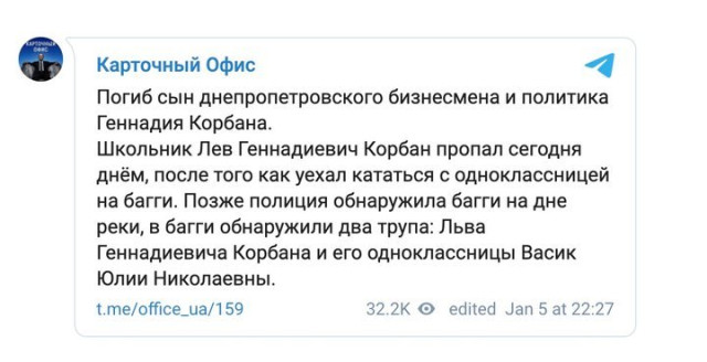 Син відомого бізнесмена й політика Геннадія Корбана – Лев Корбан – загинув 5 січня. За наразі неперевіреною інформацією, тіла школяра та його однокласниці знайшли на дні річки.