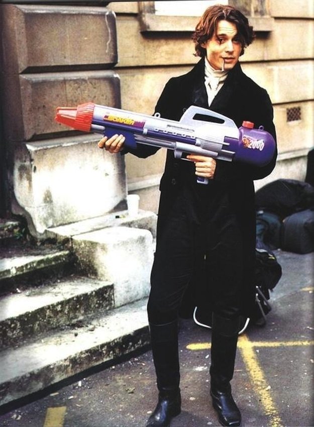 Джонні Депп з іграшковим пістолетом на зйомках фільму «Сонна Лощина».